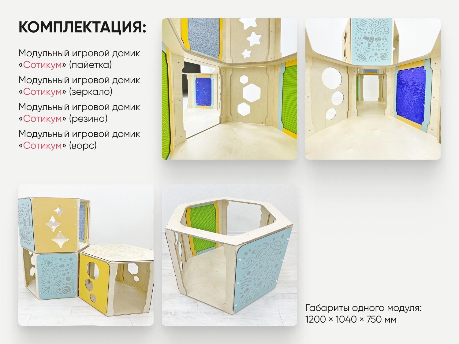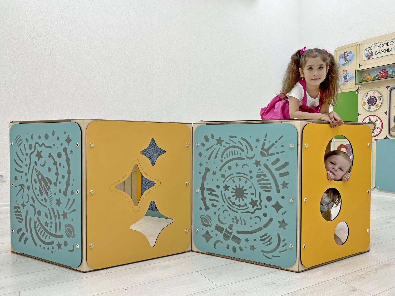 Внутри модули украшены тактильными панелями для развития сенсорной чувствительности, а снаружи – лазерной гравировкой и фигурными окошками. Они идеально стыкуются между собой и позволяют конструировать из них замки и лабиринты для маленьких непосед.