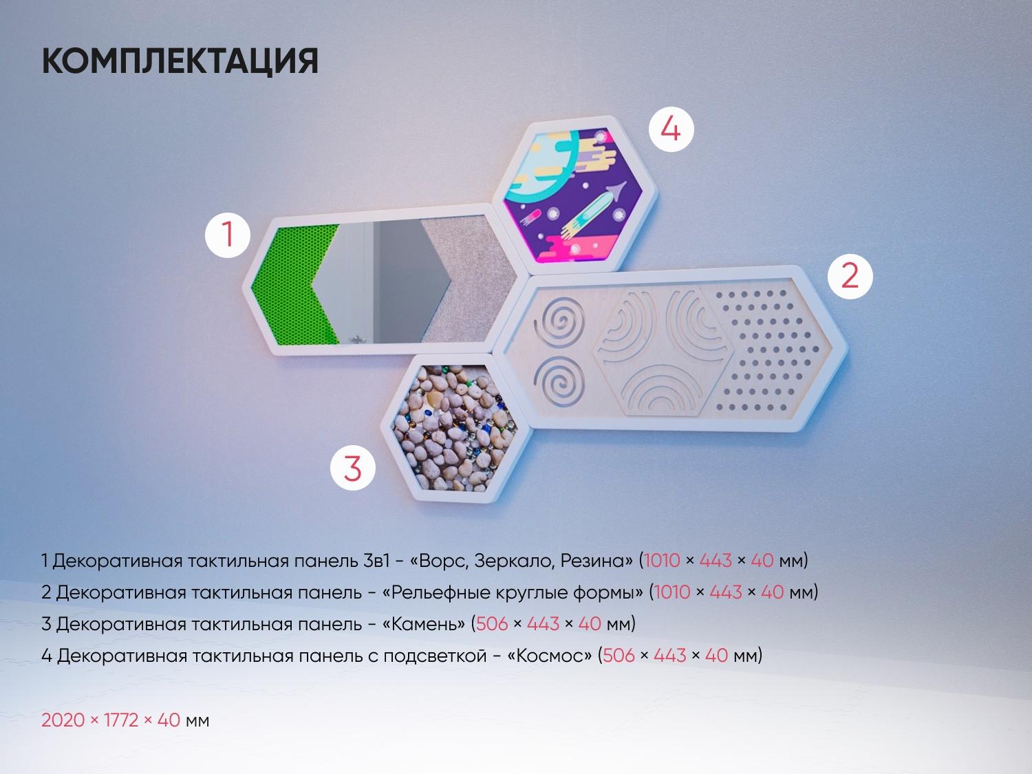 Комплект настенных модулей для развития тактильной чувствительности у детей. Сочетает в себе практическую и декоративную функции. Хорошо подходит для оформления сенсорных комнат в детских садах, развивающих центрах, медклиниках, коррекционных школах.