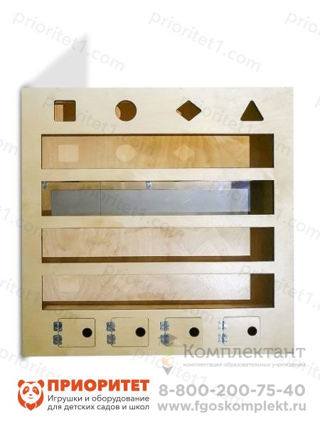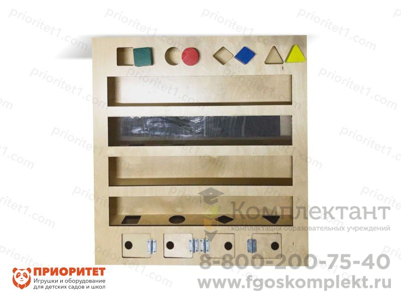 Модуль крепится на стене на уровне глаз ребенка. Обучение проходит в игровой форме. Сначала следует объяснить ребенку взаимосвязь между проекцией, формой отверстий и деталей. После чего вместе с ребенком пройти весь цикл занятий.