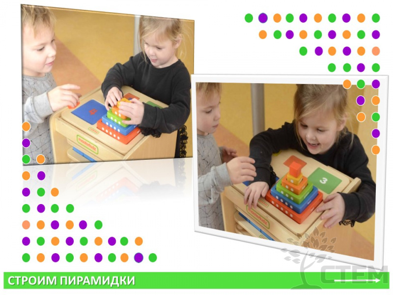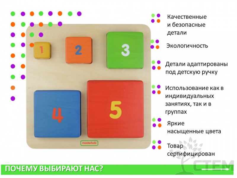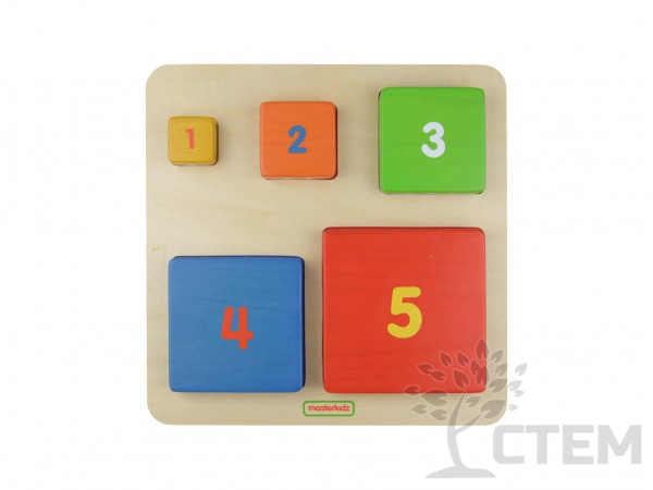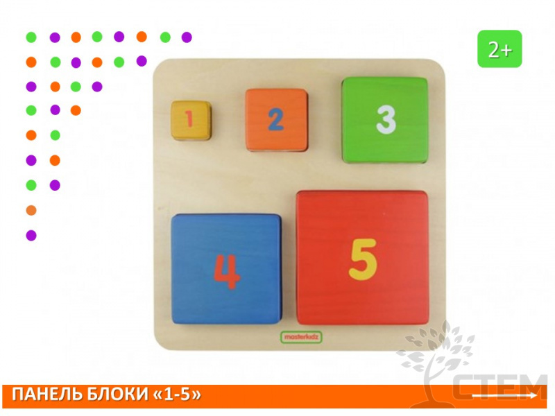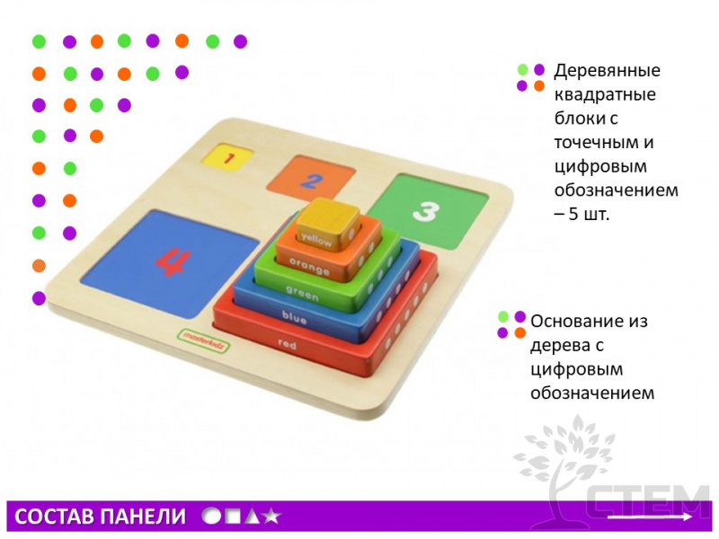 Пособие представляяет собой панель с набором из 5 блоков различных по размеру, цвету, цифре и соответствующему количеству точек. Предназначена для изучения чисел (1-5), сравнения и упорядочения размеров, сопоставления по цвету, развития двигательных навыков.