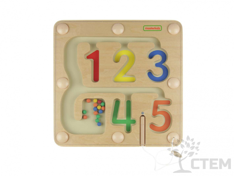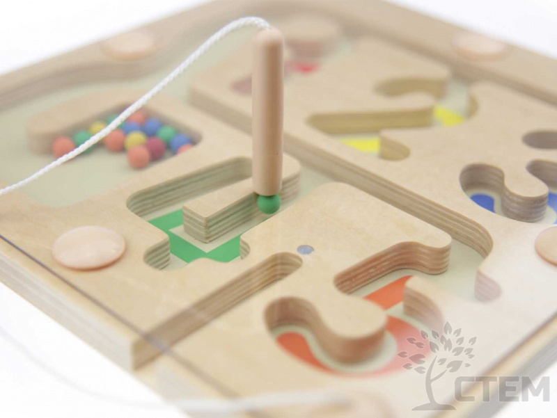 Панель выполнена из березовой фанеры, на лицевой стороне которой расположен магнитный лабиринт. Детям нужно перемещать цветные бусинки с помощью магнитной палочки на веревочке в соответствующие по цвету ячейки в форме цифр.