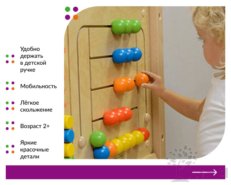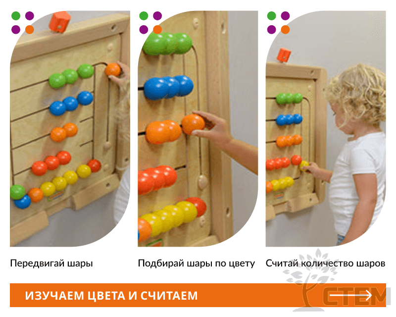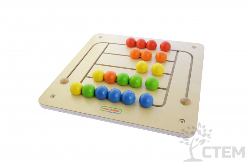 Настенная панель выполнена из березовой фанеры, на лицевой части выполнены прорези в виде лабиринта, в которых подвижно закреплены шарика различного цвета. Панель содержит детали 6 цветов, по 4 детали каждого цвета. По углам панели размещены отверстия для крепления к СТЕМ стене при помощи направляющих (в комплект не входят).