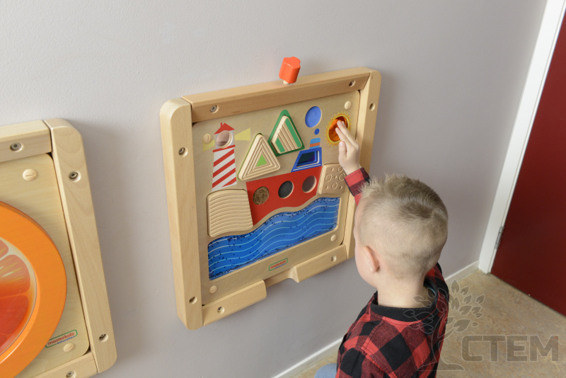 На лицевой части по основной площади, в углублениях расположены 4 образца деревянных плашек с различной текстурой поверхности, для тренировки тактильных навыков. Настенная панель выполнена из березовой фанеры толщиной 18мм., на лицевой части которой размещены углубления различной формы, в них размещены различные по тактильному восприятию материалы. Данная панель стилизованна под картину с океаном и идущим по нему кораблем.По углам панели размещены отверстия для крепления панели к стене