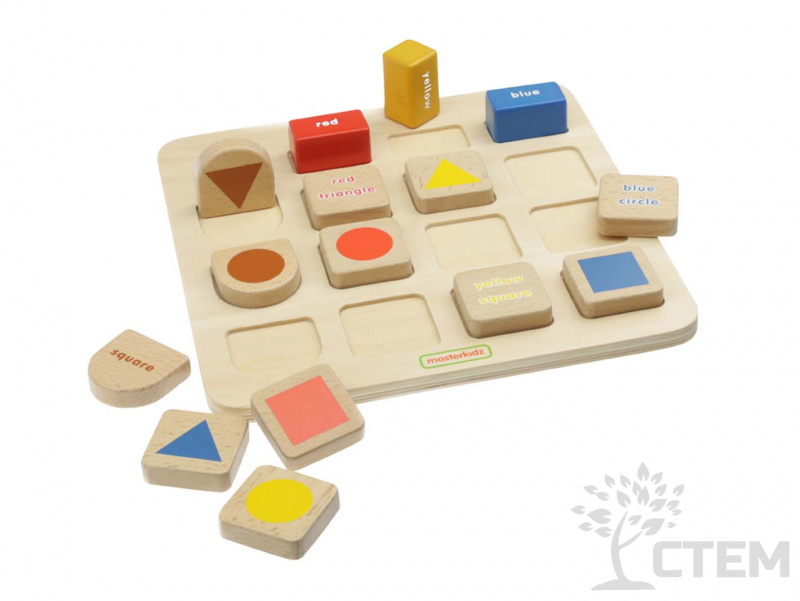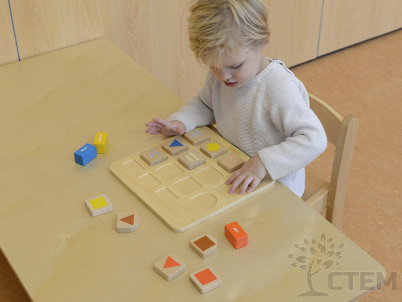 Основание панели из березовой фанеры, на лицевой части представлены деревянные блоки разных геометрических форм. Детям предлагается сопоставить блоки в соответствии с цветами в верхней части панели, либо разместить блоки правильно в соответствующие выемки - углубления.