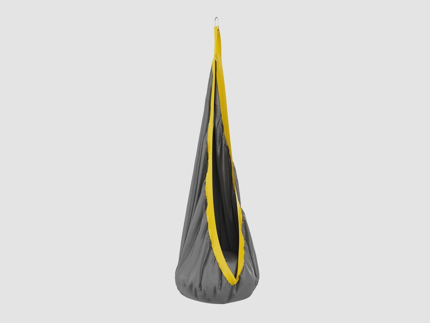 Материал изделия – водостойкая пвх-ткань в сером и жёлтом цветах, внутри сидушки мягкий поролон. Подвес гамака к комплексу осуществляется с помощью стальных карабинов и прочного нейлонового троса, выдерживающего вес до 150 кг. «Кокон» можно приобрести отдельно или в составе спортивно-игрового комплекса «Сенсорум».