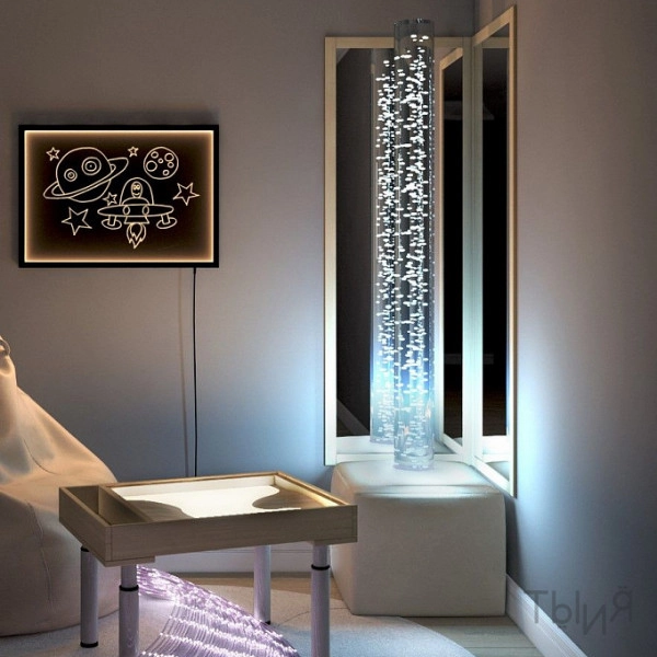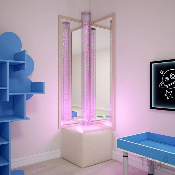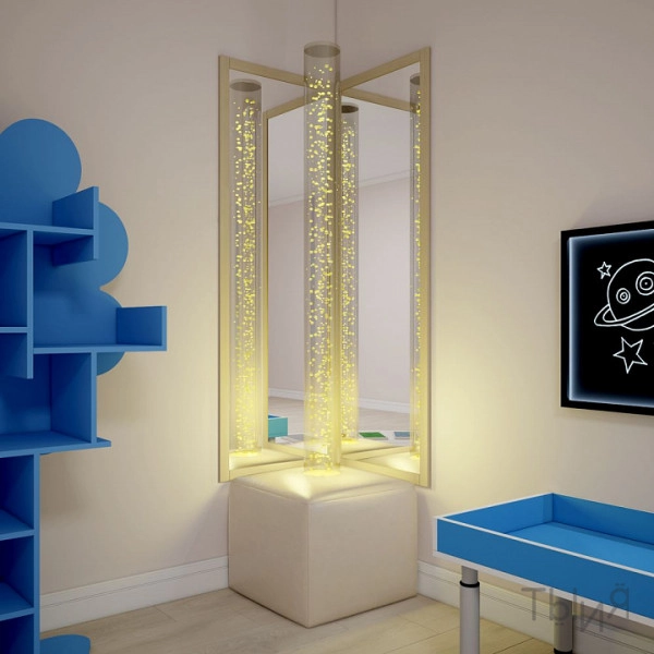 Сенсорный уголок – главный элемент комнаты. Выполнена в эко-стиле, натуральное обрамление зеркал, легкие переливы, мягкость основания.