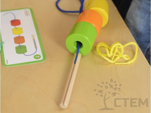 В набор входят разноцветные бусинки разной формы, 4 стойки с резьбой для нанизывания бусинок, 8 двусторонних карточек (16 упражнений разной сложности) и разноцветные шнуровки. Для комплекта также предусмотрена тканевая сумка. Набор поставляется в прочном деревянном ящике для хранения.