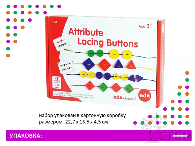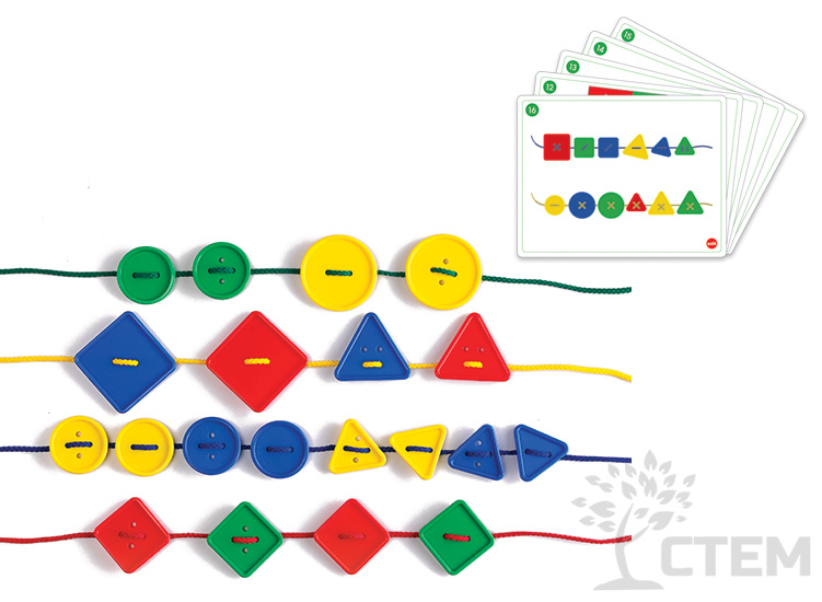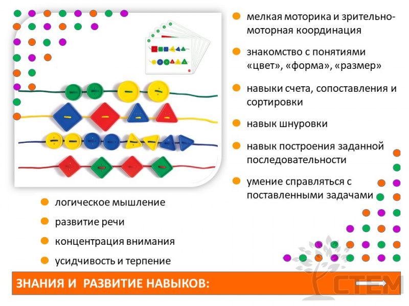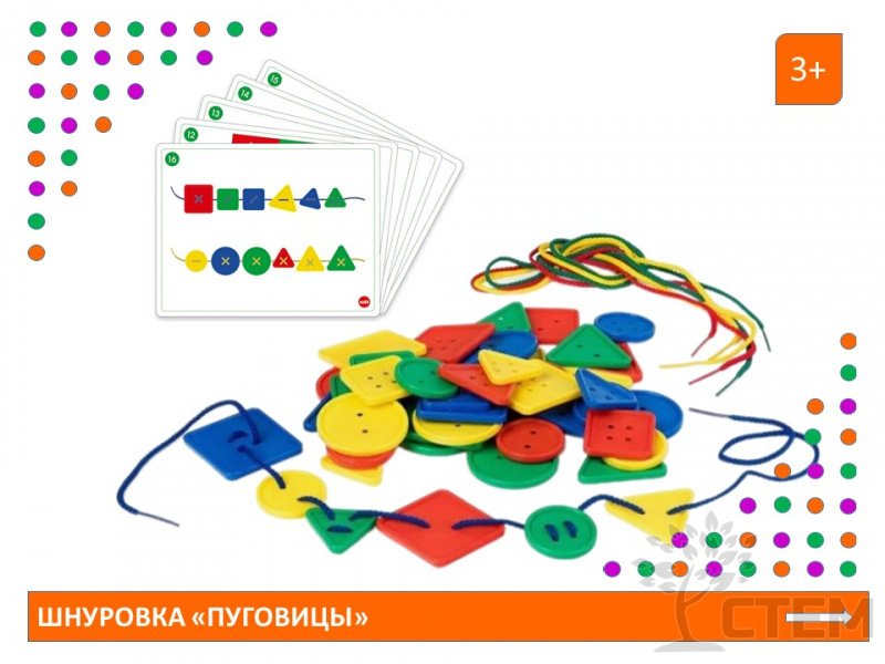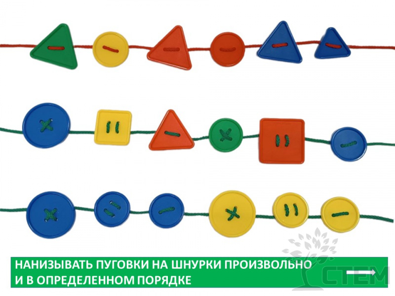Шнуровка "Пуговицы" (3 формы, 2 размера, 4 цвета, 48 шт., 4 шнурка, 10 карточек).