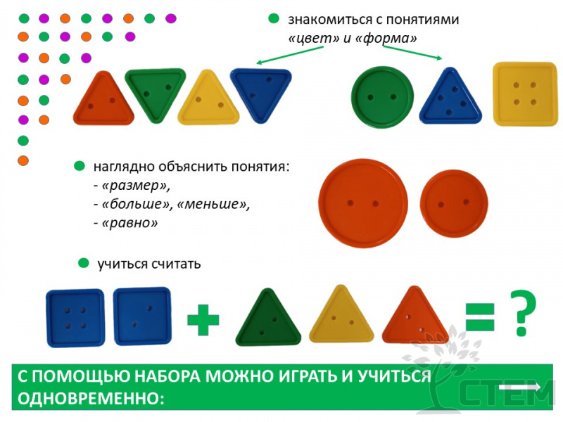 С помощью этого набора также можно изучать счет и сортировку, знакомиться с понятиями"форма", "цвет" и "размер".