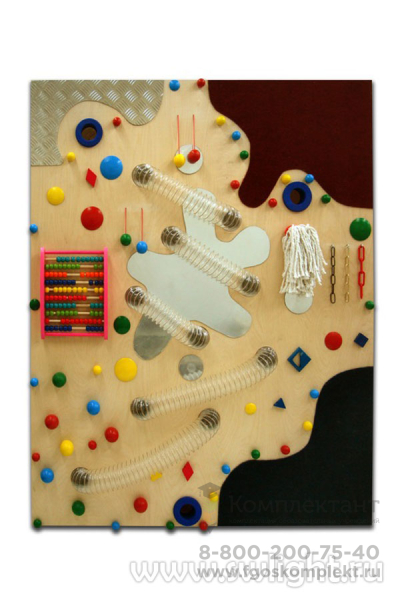 На корпусе панели установлена прозрачная труба, по которой скатываются мячики на глазах у наблюдающего. Снизу крепится специальнывй лоток для мячей. Если мячик бросить в верхнее отверстие - он, прокатившись через трубочки, выкатится снизу в лоток. Также на корпусе закреплены предметы, способствующие развитию тактильного, визуального и звукового восприятия.