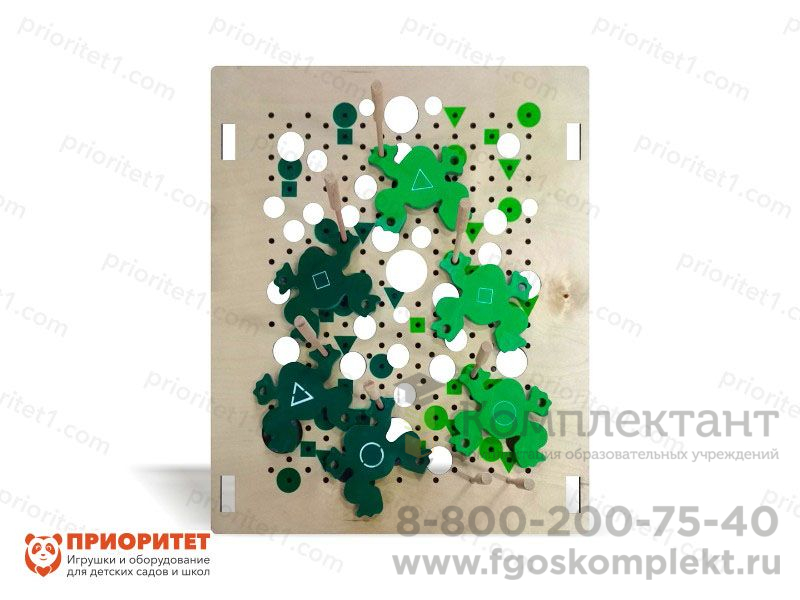 Необычная доска привлекает внимание множеством отверстий. По всему полотну усеяны маленькие, круглые дырочки. Также есть крупные дырки круглой формы и изображения разных геометрических фигур: треугольники, квадраты, круги. Иногда эти фигуры наложены друг на друга. Полотно является игровым полем, на котором можно разместить фигурки лягушек. Их можно перемещать, устанавливать в любом месте. Это позволяет превращать занятие по развитию мелкой моторики, пространственного мышления в яркую и увлекательную игру.
