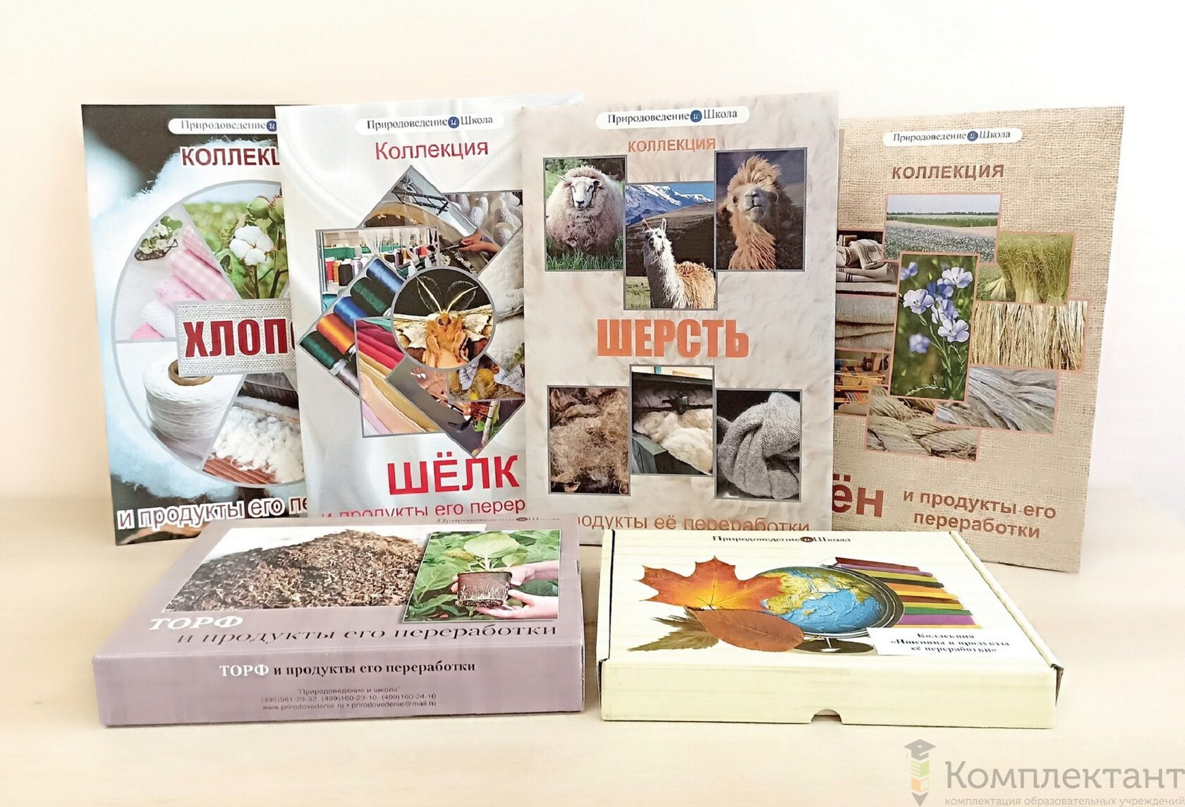 4) Коллекция «Шерсть и продукты ее переработки». Коллекция предназначена для использования в общеобразовательных учреждениях. Комплектность: складная папка (паспарту) с рисунками и наклеенными на неё натуральными образцами. На внутренней стороне папки представлены рисунки различных пород овец, схема технологического процесса производства шерстяных тканей, основные этапы переходов от руна (шерстяного волокна) до шерстяных тканей. Представлены натуральные образцы, характеризующие эти переходы.