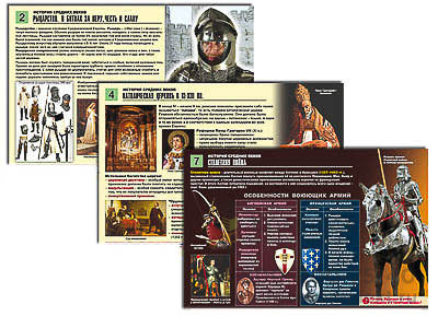 Таблицы: 1. Духовенство. В молитвах за род человеческий. 2. Рыцарство. В битвах за веру, честь и славу. 3. Крестьянство. В трудах и заботах о хлебе насущном. 4. Католическая церковь в XI–XIII вв. 5. Инквизиция. 6. Возникновение ислама. 7. Столетняя война. 8. Архитектура Западной Европы XI–XV вв.