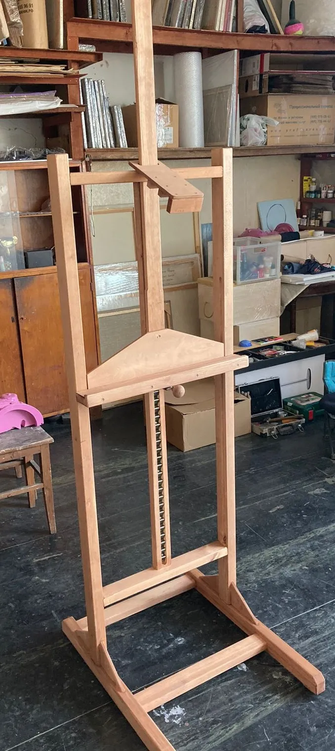 Материал: брус сечение 40х60, 30х60, 60х15, 20х40 , фанера ABB толщина 10мм. Габаритные размеры, в мм: высота 2200, база основания 585х785, высота полки регулируется от 400 до 1600. Максимальный размер холста, в мм: 1910х3200.