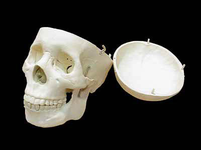 Модель высотой около 15 см, изготовлена из пластмассы. Модель является разборной, позволяет продемонстрировать расположение костей как снаружи черепа, так и внутри черепной коробки.