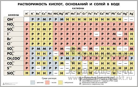 Таблица содержит информацию о растворимости кислот, оснований и солей в воде, характере среды образующегося раствора и возможности его получения. формат, мм 950х1500; плотность бумаги, г/м2 150;