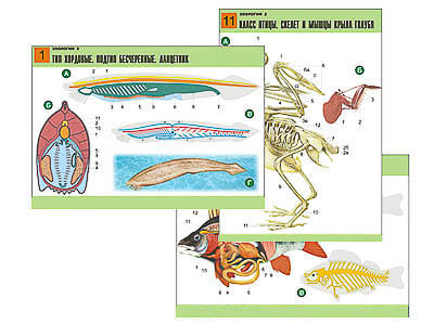 Перечень таблиц: 1. Тип Хордовые. Подтип Бесчерепные. Ланцетник. 2. Надкласс Рыбы. Скелет окуня. 3. Надкласс Рыбы. Внутреннее строение окуня. 4. Многообразие рыб. 5. Класс Земноводные. Скелеты лягушки и тритона. 6. Класс Земноводные. Внутреннее строение лягушки. 7. Многообразие земноводных. 8. Класс Пресмыкающиеся. Скелеты пресмыкающихся. 9. Класс Пресмыкающиеся. Внутреннее строение ящерицы. 10. Многообразие пресмыкающихся. 11. Класс Птицы. Скелет и мышцы крыла голубя. 12. Класс Птицы. Внутреннее строение голубя. 13. Многообразие и экологические группы птиц. 14. Класс Млекопитающие. Скелет и мышцы. 15. Класс Млекопитающие. Внутреннее строение кролика. 16. Многообразие млекопитающих.