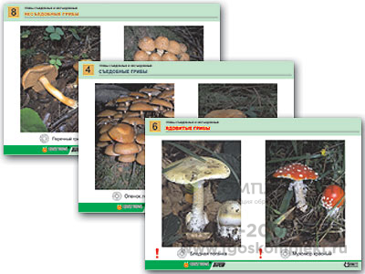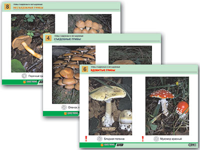 Пособие предназначено для использования в качестве раздаточного материала. Комплектность: таблицы с фотографиями грибов – 8 шт., руководство по эксплуатации – 1 шт. Пособие состоит из 8 полноцветных таблиц формата А4, напечатанных на картоне и ламинированных глянцевой пленкой. Представлено 10 фотографий съедобных грибов (белый гриб, подберезовик, подосиновик, масленок, лисичка, сыроежка, опенок летний, опенок осенний, шампиньон, груздь черный), 4 фотографии ядовитых грибов (бледная поганка, мухомор красный, мухомор пантерный, сатанинский гриб) и 2 фотографии несъедобных грибов (перечный гриб, чешуйчатка огненная), указаны их видовые названия.