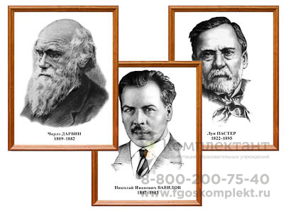Перечень портретов: 1. Вавилов Николай Иванович. 2. Вернадский Владимир Иванович. 3. Дарвин Чарлз. 4. Линней Карл. 5. Мечников Илья Ильич. 6. Мичурин Иван Владимирович. 7. Павлов Иван Петрович. 8. Пастер Луи.