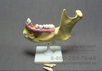 Модель «Челюсть человека» предназначена для использования в общеобразовательных учреждениях на уроках биологии, в качестве демонстрационного пособия по разделу «Человек и его здоровье», темам « Опорно-двигательная система. Скелет головы» и «Пищеварительная система. Строение и расположение зубов». Комплектность 1. Модель «Челюсть человека» (разборная) -1шт. (состоит из 6 деталей) 2. Подставка -1шт. 3. Металлический штырь -1шт. 4. Паспорт -1шт. 5. Упаковочная коробка -1шт. Характеристики изделия Разборная, объемная модель представляет собой увеличенный образец нижней челюсти с зубами. Она изготовлена из пластмассы, раскрашена в естественные цвета и установлена на подставку. Высота модели не менее 29 см, длина модели не менее 31 см. Модель позволяет ознакомиться со строением нижней челюсти человека, расположением на ней зубов, с подходящими к ним кровеносными сосудами и нервами, рассмотреть типы и конфигурацию зубов человека, а так же их внутреннее строение. '>Модель «Челюсть человека» предназначена для использования в общеобразовательных учреждениях на уроках биологии, в качестве демонстрационного пособия по разделу «Человек и его здоровье», темам « Опорно-двигательная система. Скелет головы» и «Пищеварительная система. Строение и расположение зубов». Комплектность 1. Модель «Челюсть человека» (разборная) -1шт. (состоит из 6 деталей) 2. Подставка -1шт. 3. Металлический штырь -1шт. 4. Паспорт -1шт. 5. Упаковочная коробка -1шт. Характеристики изделия Разборная, объемная модель представляет собой увеличенный образец нижней челюсти с зубами. Она изготовлена из пластмассы, раскрашена в естественные цвета и установлена на подставку. Высота модели не менее 29 см, длина модели не менее 31 см. Модель позволяет ознакомиться со строением нижней челюсти человека, расположением на ней зубов, с подходящими к ним кровеносными сосудами и нервами, рассмотреть типы и конфигурацию зубов человека, а так же их внутреннее строение.