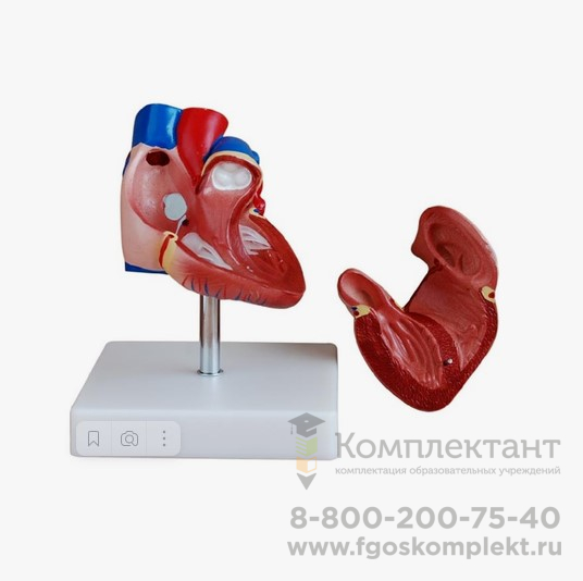 Демонстрационное учебное пособие - анатомическая модель сердца человека, увеличенная в 4 раза. Разбирается на 3 части. На подставке. Материал - пластик.