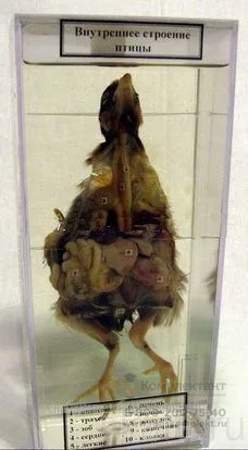 Препарат предназначен для использования в общеобразовательных учреждениях, в качестве демонстрационного материала на уроках биологии, раздел - «Животные», тема «Класс Птицы». Препарат смонтирован на стеклянной пластине, которая помещена в сосуд с консервирующей жидкостью. Пластина закреплена в пазах сосуда и крышки. Сосуд герметично закрыт.