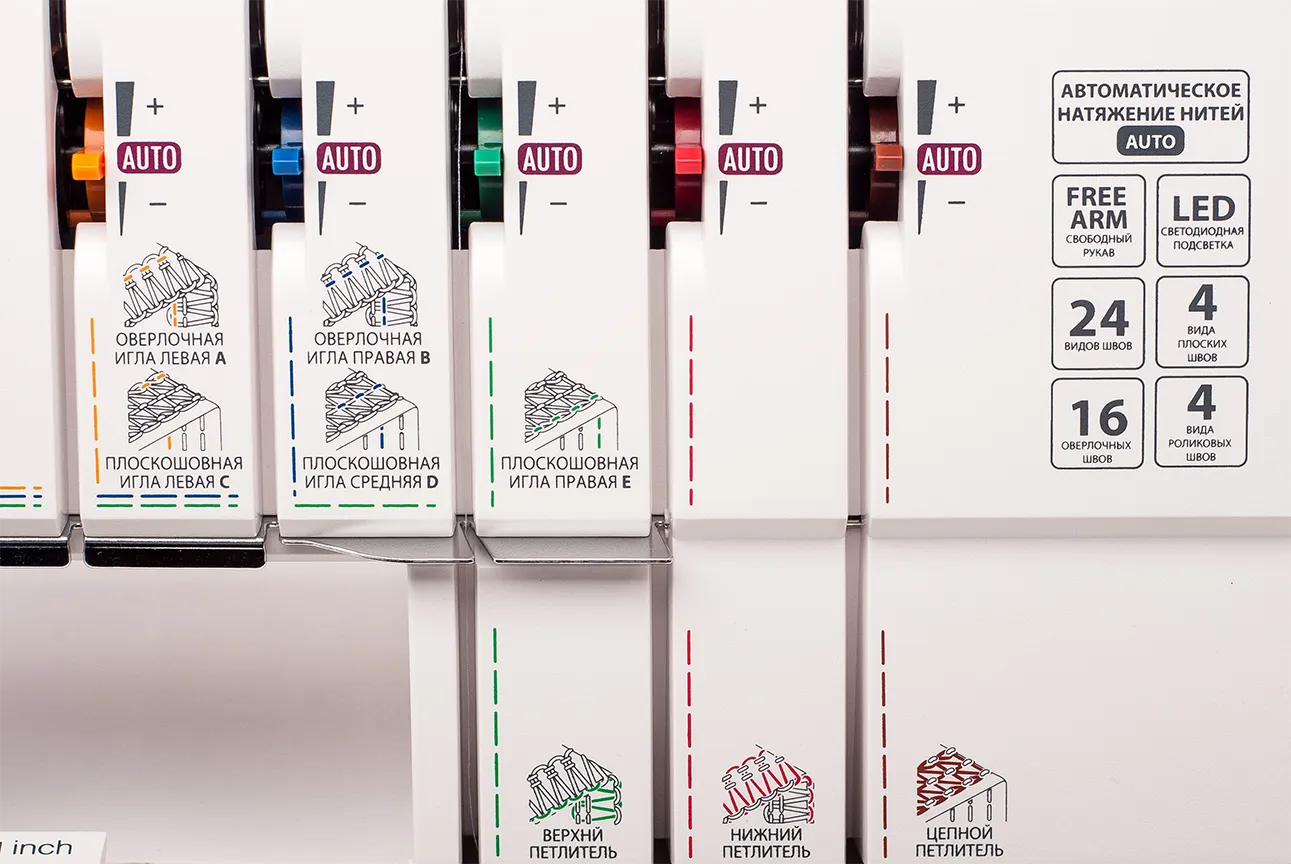 2-игольный узкий, 2-игольный широкий, 2-х ниточный оверлочный шов (широкий), 2-х ниточный эластичный оверлочный шов (узкий), 3-игольный распошивальный, 3-ниточный широкий, 3-х ниточный оверлочный шов (узкий), 3-х ниточный оверлочный шов (широкий), 4-х ниточный оверлочный шов, 5-ти ниточный широкий оверлочный шов, закрепочный 4-ниточный, распошивальный 2-ниточный, распошивальный широкий, роликовый 2-ниточный, роликовый 3-ниточный, узкий 3-ниточный, цепной стежок