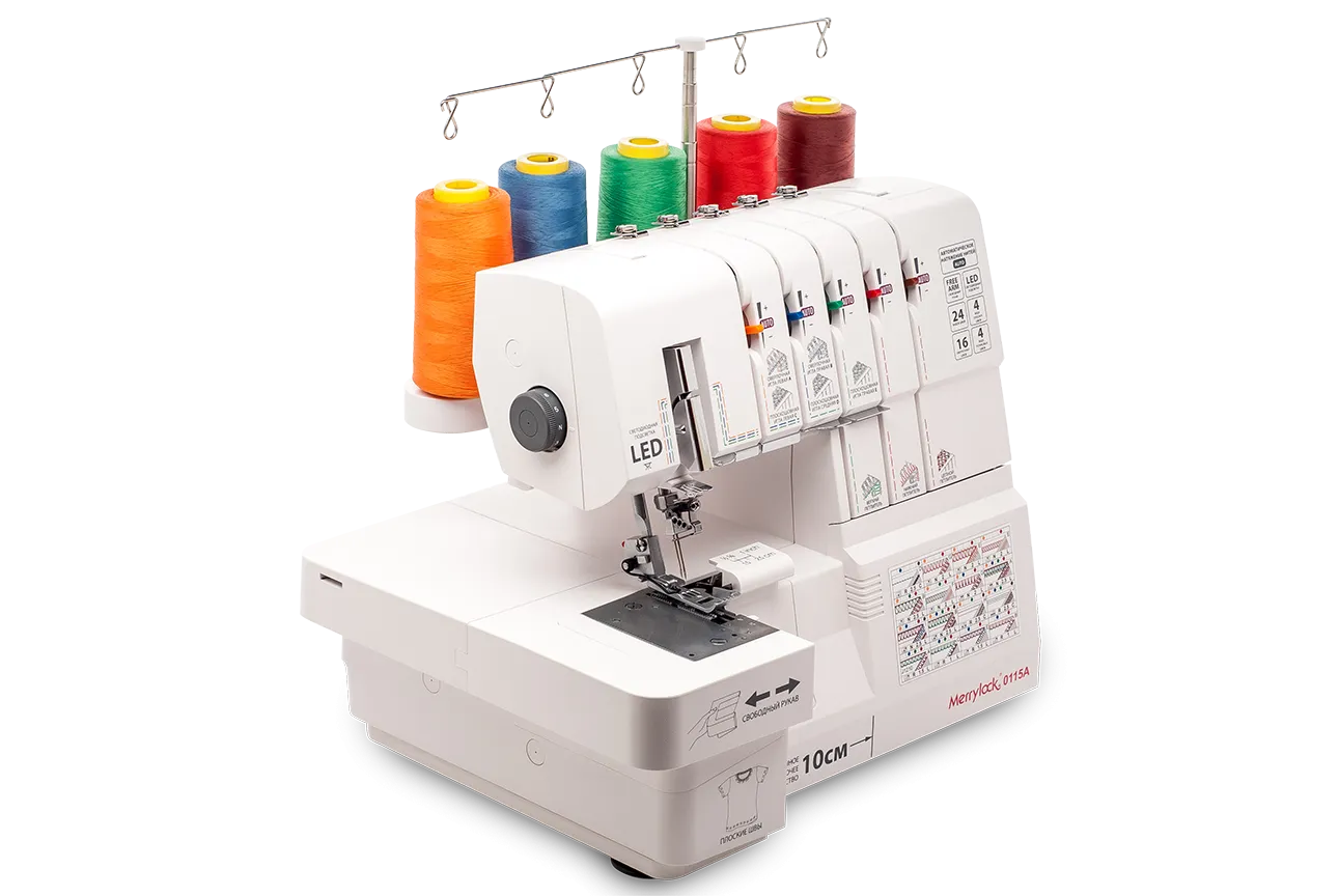 Модель Merrylock 0115А – это новый пятиниточный коверлок с автоматическим натяжением нитей. Главные отличия новой модели: свободный рукав. Свободный рукав позволяет обрабатывать рукава, низ штанин и других труднодоступных цилиндрических изделий. Светодиодная LED подсветка обеспечивает 10 000 часов работы без смены лампы. Расширенная рабочая поверхность - от иглы до станины 10 см.