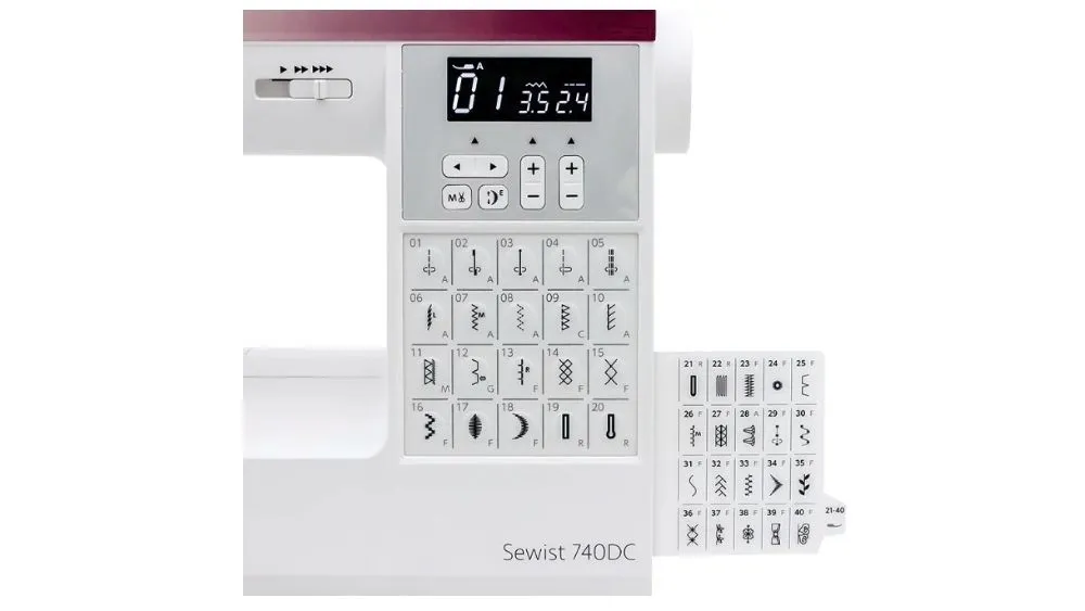 На встроенном в швейную машину Janome Sewist 740DC ЖК-дисплее показывается данные о выборе режима шитья: вид строчки, длина стежка, ширина строчки и какую лапку нужно взять для выполнения задуманного. Выметывание 3-х видов петель производится автоматически. В рабочей зоне есть светодиодная подсветка.