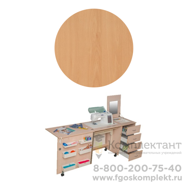 1. Справа в тумбе 3 выдвижных ящика для хранения различной швейной фурнитуры, катушечница большая на 56 катушек на выдвижной полке, глубокий секционный контейнер для аксессуаров, зеркало.