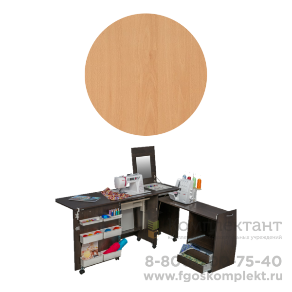Благодаря оригинальной конструкции выкатной тумбы, которая образует полноценную рабочую поверхность, за этим столом удобно работать как на швейной машине, так и на оверлоке.