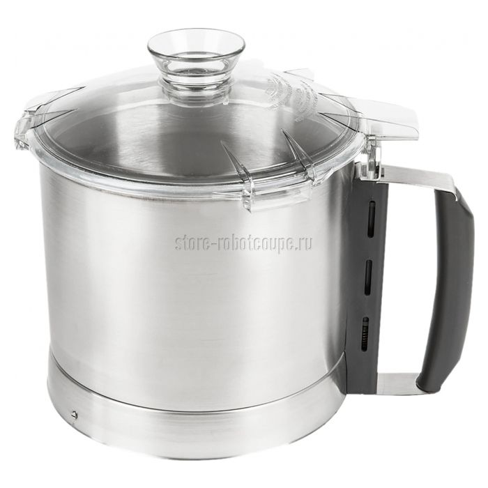 Благодаря прозрачной крышке, изготовленной из поликарбоната, можно контролировать процесс смешивания продуктов в куттере, а также добавлять необходимые ингридиенты через специальное отверстие в процессе приготовления, не опасаясь разбрызгивания. Съемная чаша объёмом 4,5 литра изготовлена из нержавеющей стали и имеет удобную ручку.