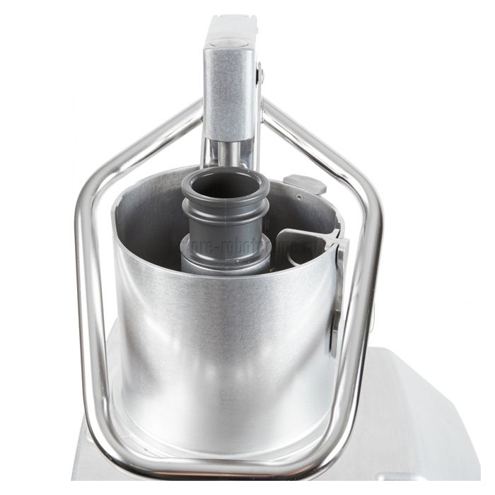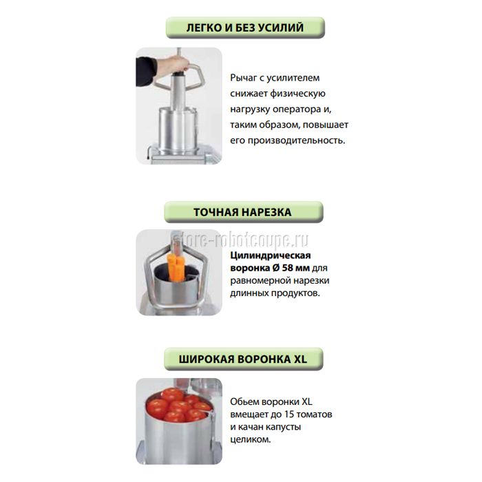 Данная комплектация имеет две воронки: автоматическая воронка для работы с большой загрузкой и скоростью, которая обеспечивает постоянную подачу продуктов в загрузочный отсек (без предварительной обработки овощей или фруктов), а специальная трубка применяется для безостановочной нарезки длинных и нежных овощей и фруктов; воронка с рычагом имеет два круглых отверстия разного диаметра Ø175 мм для крупных овощей и фруктов (капуста, помидоры, сельдерей и т.д.) и Ø59 мм для продолговатых и нежных продуктов (бананы, огурцы, морковь и т.д.). Наивысшая производительность овощерезки - до 400 кг/ч. При опускании механически усиленного рычага-толкателя двигатель автоматически запускается, что значительно облегчит работу ваших поваров, а при открывании крышки срабатывает тормоз и останавливает работу двигателя.