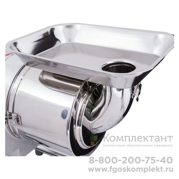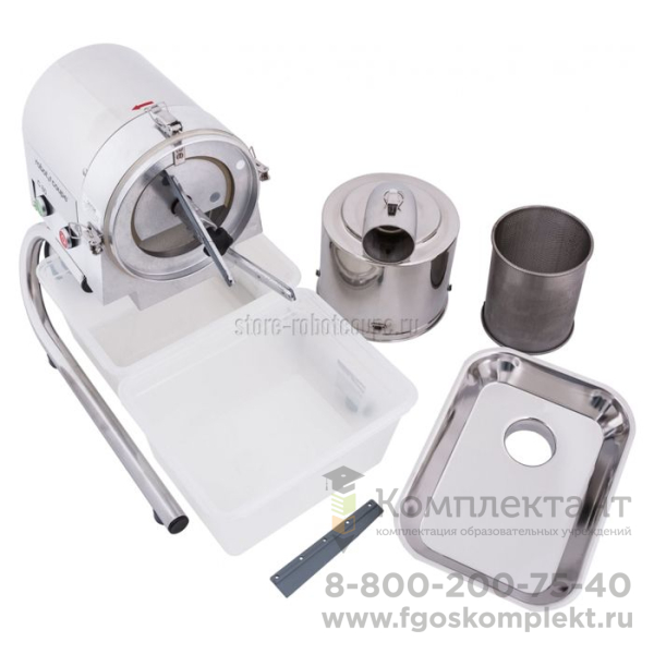 Комплектация включает цилиндрическое сито из нержавеющей стали с отверстиями Ø1 мм, куда попадают фрукты и овощи для протирки. Лопасти протирочной машины веращаются со скоростью 1500 об/мин, для получения сока и мякоти. Эргономика аппарата позволяет использовать емкости для готовой продукции больших размеров.