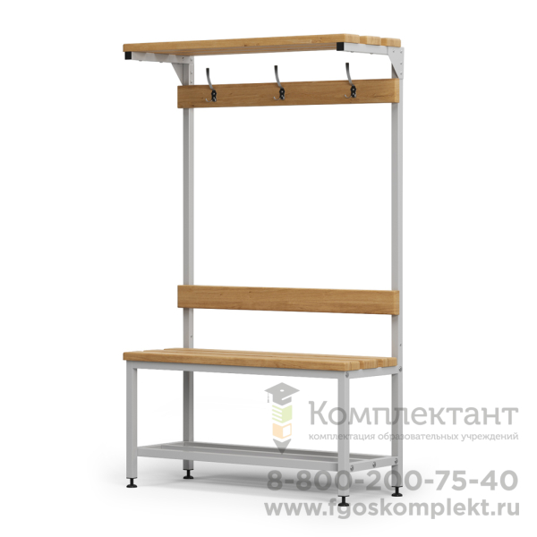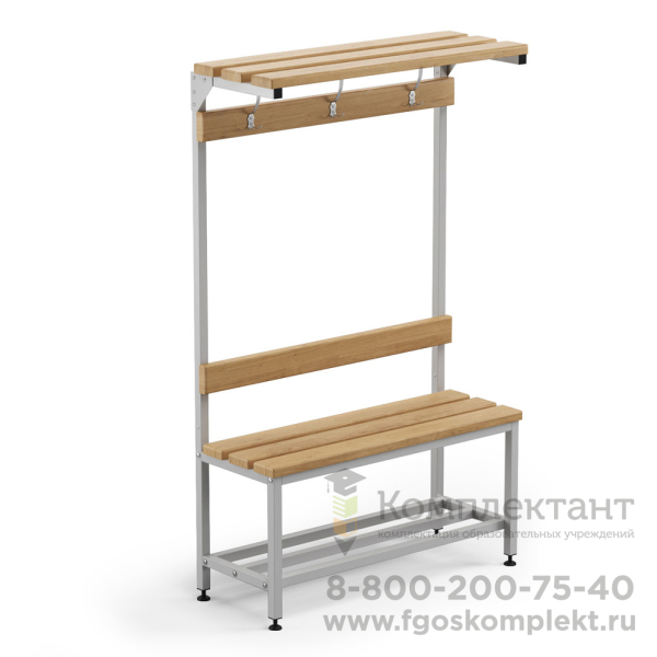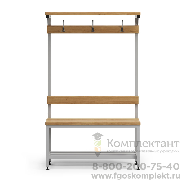 Очень прочные и долговечные скамейки для раздевалок со спинкой, вешалкой и полкой для шапок и подставкой под обувь внизу лавки. Все элементы скамеек отличаются надёжностью, скамьи практичны и неприхотливы в эксплуатации. Полимерное защитно-декоративное покрытие, особо прочное, коррозионно-стойкое, устойчиво к перепадам температуры. Сиденье скамьи — три массивные доски (древесина хвойных пород толщиной 30 мм), пропитанные антисептиком и покрытые водостойким лаком. Скамейка снабжена спинкой, вешалкой и верхней полкой, стойка к влаге, и большим нагрузкам, что обусловливает широкий диапазон условий её использования. Скамья — разборная, конструкционные элементы её скрепляются с помощью винтов и стяжек М6. На неровной поверхности скамья легко выставляется ровно благодаря возможности плавной регулировки ножек по высоте.
