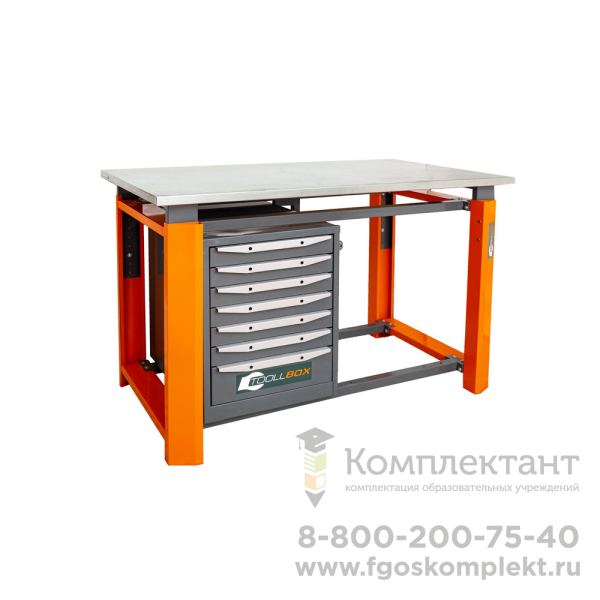 Столешница изготовлена из фанеры 30мм и закрыта стальным оцинкованным листом 1,2мм. Глубина столешницы 750мм. Предусмотрена регулировка положения столешницы по высоте. Высота регулировки столешницы верстака может регулироваться по желанию заказчика в диапазоне 924-1044 мм.