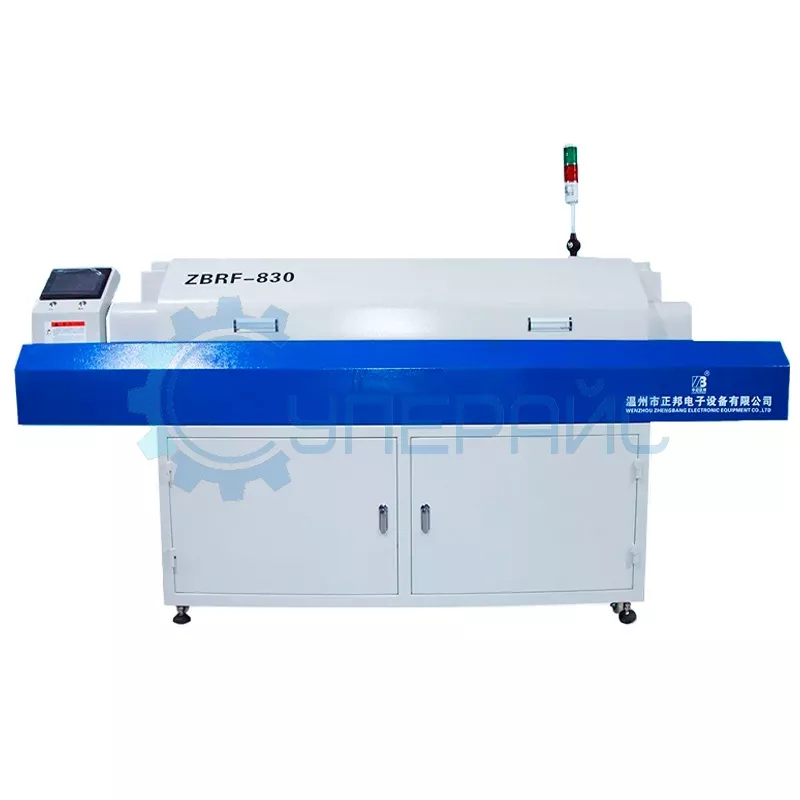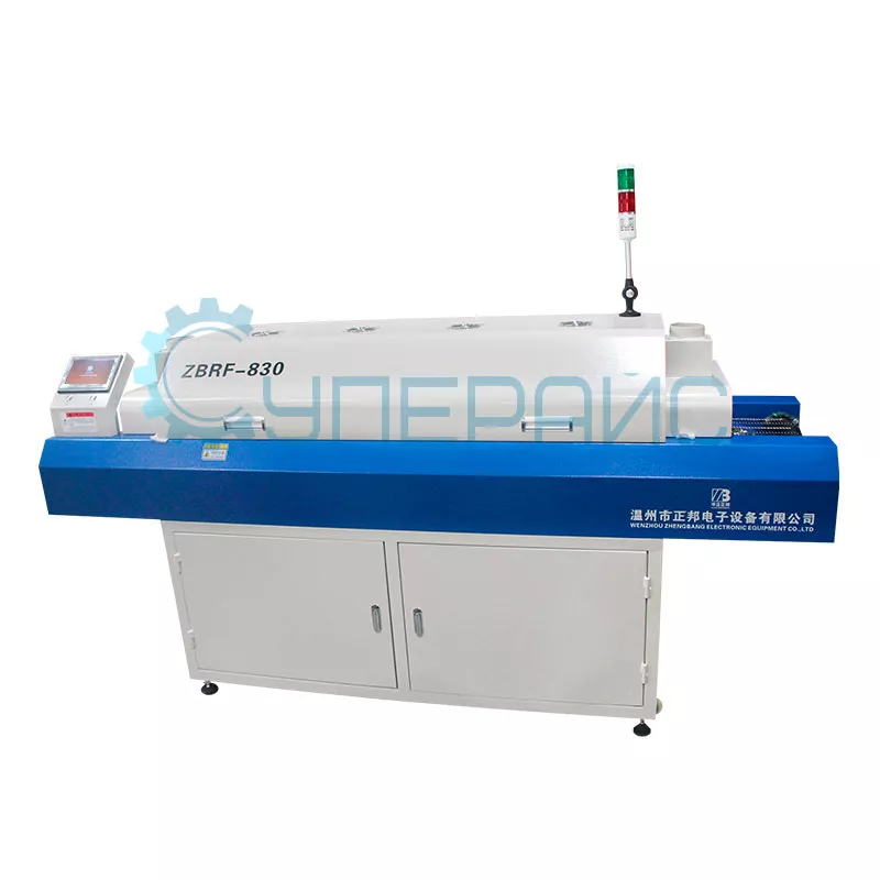 Печь конвекционного оплавления ZBRF830 оборудована сенсорным экраном, звуковой индикацией и сигнальными огнями для своевременного информирования пользователя. Эргономичный корпус прибора дополнен шкафом для оборудования, что удобно при необходимости использовать дополнительные инструменты. Нагревательный тоннель длиной 1400 мм создаёт условия для равномерного всестороннего нагрева компонентов.