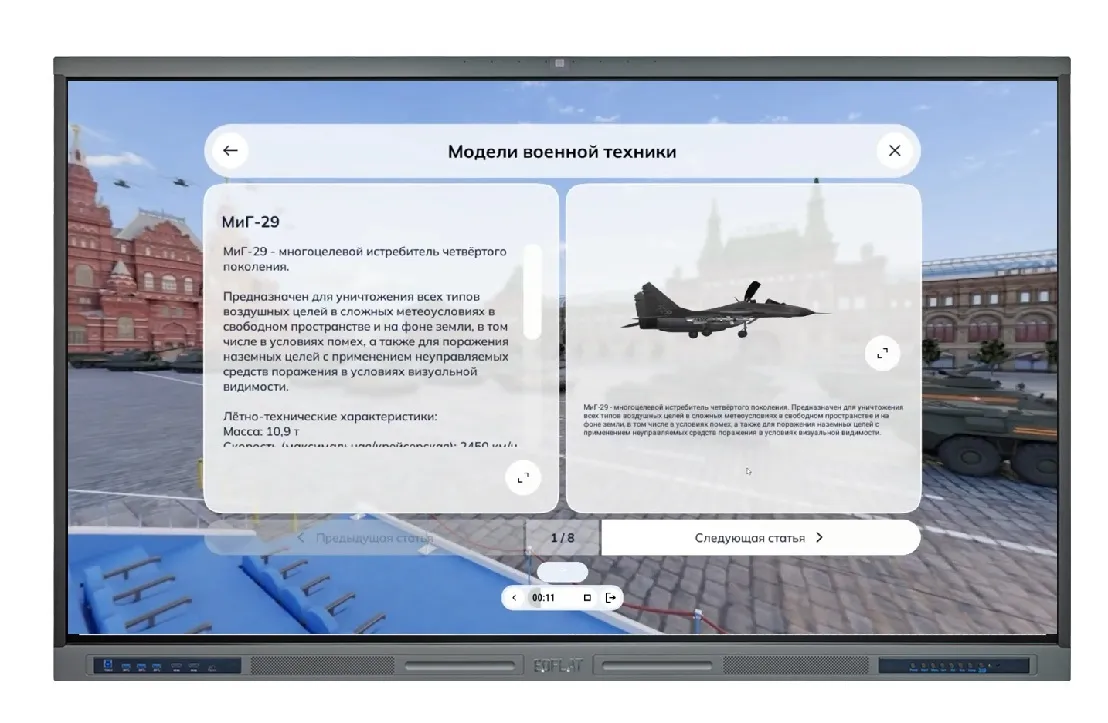 - при нажатии на одну из интерактивных моделей активируется голосовая подсказка с описанием изображённого предмета, его назначения, области применения и технических характеристик (при наличии);