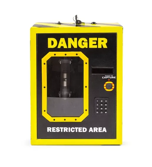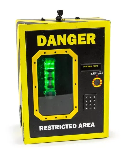 Антуражный девайс для проведения сценарных игр, стилизованных под Fallout, Doomsday и им подобных. Впервые опробован в сценарной игре на Международном фестивале лазертага «Майские манёвры»-2019. Так понравился участникам, что после фестиваля LASERWAR запустила устройство в массовое производство.«Хранилище судного дня» представляет собой электронный сейф из металла и пластика, где хранится колба с условно радиоактивным (или биологически опасным) веществом. По сценарию, колбу нужно извлечь из сейфа и доставить по назначению.Для открытия хранилища необходимо подобрать комбинацию к цифровому кодовому замку. Процесс подбора числа запускается выстрелом из тагера в сенсор хранилища. По умолчанию он занимает 2 минуты, после чего цифра кода высвечивается на информационном дисплее, и игрок может выстрелом запустить дешифрацию следующей цифры.Если противник тоже пытается овладеть добычей и попадёт в сенсор, запустится новый цикл дешифрации, который сбросит код соперника. Таким образом, для открытия 6-значного кода с 2-минутной дешифровкой (значения по умолчанию) команда должна захватить и в течение 12 минут удерживать «Хранилище» до завершения взлома.Полученный код вводят при помощи цифровой панели, при этом он отображается на информационном OLED-дисплее. Срабатывает магнитный замок, открывающий дверцу хранилища. Игроки могут забрать колбу с «радиоактивным веществом», которая, оказавшись вне хранилища, начинает испускать характерный треск счетчика Гейгера и импульсы радиации. Игрок, находящийся в непосредственной близости от колбы слишком долго, рискует своим игровым «здоровьем».Уровень поражения - 10 единиц здоровья каждую минуту.Дальше колбу надо доставить по назначению, в зависимости от выбранного сценария.Колба можно использовать и как отдельный артефакт - источник радиации.Наши разработчики постоянно работают над расширением сценарных возможностей устройств. Уже сейчас «радиоактивные» колбы можно использовать для различных сценарных целей - минирования, в качестве источников энергии, для дезактивации. Всё ограничивается только фантазией организаторов.