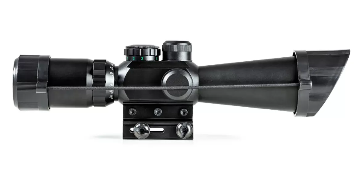 Особый интерес этот прицел представляет широкими возможностями настройки. Так, помимо приближения, предусмотрена настройка резкости, позволяющая четко видеть соперника при любом показателе кратности. Отличительной чертой данного оптического прицела от других является возможность подсветки перекрестия (два цвета - красный и зеленый) и регулировка яркости. Конструкция ОП позволяет устанавливать его на все игровые комплекты, имеющие планки Пикатинни. Дальность видения пятна ЛЦУ колеблется от 10 до 200 метров в диапазоне освещенности от 2000 - 3000 люкс (солнечный день, в тени) до 2 люкс (полутемное помещение).Основные характеристики: масса 600 г, длина прицела: 270 мм, длина планки: 60 мм, кратность: от 3,5 до 10, диаметр входного зрачка: 40 мм.