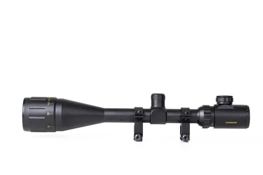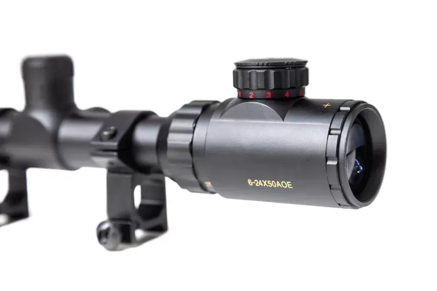 6-24X50AOE представляет собой оптический прицел переменной кратности, обеспечивающий получение высококачественного изображения. Главные плюсы данной модели - яркость и четкость изображения, широкое поле зрения, простота эксплуатации - обеспечили ей широкий спрос среди лазертаг-игроков.Прицел оборудован кольцом кратности и регулировкой фокуса. Первое позволит отрегулировать увеличение, второе - настроить изображение под особенности своего зрения (дальнозоркость или близорукость), поэтому игрокам с дефектами зрения можно вести стрельбу без очков. Прицельная сетка имеет подсветку двух цветов (зеленую и красную). За подсветку прицельной сетки отвечает барабан, регулирующий яркость в 5 режимах для каждого из цветов. Узлы поправки расположены в верхней и боковой части корпуса.На объективе расположено кольцо отстройки от параллакса. На обойме объектива нанесена шкала, обозначающая дистанцию фокусировки. Параллакс устраняется вращением кольца на объективе при настройке объектива на нужную дистанцию стрельбы.Кроме этого, комплект поставки включает в себя защитные стекла со светофильтром, инструкцию и кольцевые крепления на планку 22 мм.Характеристики:кратность - 6-24;диаметр объектива - 50 мм;система Adjustable Objective;введение поправок осуществляется с помощью барабанчиков, расположенных на корпусе прицела;подсветка сетки - красный, зеленый