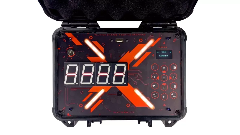 Ядерный чемоданчик «Периметр» представляет собой развитие известного среди игроков в лазертаг «Имитатора взрывного устройства». Представляет собой компактный кейс с 3 сценарными функциями. Позволяет решать такие игровые задачи, как минирование и разминирование.Девайс включает и перезагружает инструктор с помощью стандартного ключа. Игроки могут только активировать и деактивировать условное взрывное устройство при помощи пароля и флешки. Если «ИВУ» не деактивировать вовремя, он отнимет все «жизни» игроков в радиусе действия.- Дизайн в милитари стиле в красных тонах.- Девайс изготовлен из ударопрочного АБС-пластика чёрного цвета. В конструкции предусмотрена ручка для переноски.- «Периметр» не нужно подключать к компьютеру для настройки: параметры меняются в меню администратора прямо на полигоне. Вся информация выводится на два экрана: сегментный (для отсчёта времени) и OLED-дисплей (для всех меню, ввода пароля, названия клуба и т.д.).- Радиус поражения - до 15 метров в помещении за счет большого рикошета от потолка.- Полный пакет звуковых эффектов и речевых подсказок.- Интеграция в сценарии ALPHATAG и X-GEN при помощи встроенного Wi-Fi модуляРекомендовано в прокат!