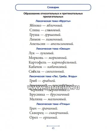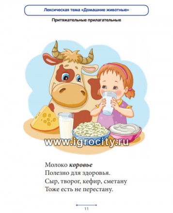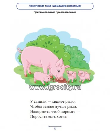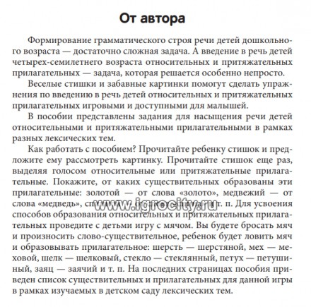 В блокноте представлены веселые стишки, которые помогут дошкольникам усвоить способы образования относительных и притяжательных прилагательных, а значит, сделать речь образной и богатой. Данный способ словообразования отрабатывается при изучении нескольких лексических тем, названия которых указаны в верхней части каждой страницы. Приобретенные знания закрепляются в игровых заданиях.