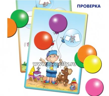 Тема: Предлоги, ориентировка в пространстве. Описание сюжетных картинок. Геометрические фигуры. Неизвестно почему, но мыши в нашем сознании прочно ассоциируются с сыром, хотя они с большим аппетитом поглощают и другую человеческую пищу. Но раз уж так вышло… предоставим возможность этим классическим сырно-мышиным отношениям принести "дидактическую" пользу. В игре плоские несъедобные геометрические фигуры превращаются в вожделенные ломтики сыра разнообразных форм. Угостили мышонка - заодно поговорили о том, чем квадратный кусочек отличается от треугольного или - что форма сыра, например, похожая на лодочку, называется трапецией. Увидели фигурки на шарике, назвали их, и… - не попадите в ловушку! Чтобы получить свой шар, нужно правильно определить, с какой стороны расположился мышонок - слева, под или (уж повезло так повезло!) между двумя сырными фигурками. Когда, наконец, все выяснено, полученный шарик кладется на свое место. Чтобы лишний раз убедиться в правильности ответа, переверните шарик цветной стороной вверх. Если "хвостик" и его шарик оказались одинакового цвета - значит, фигурки, мыши, сыр - все стало на свои места! Как обычно бывает в наших играх, есть здесь и усложненный вариант нахождения своих шариков, и их классификация, и описание картинки, и, конечно, удовольствие от игры в компании с мышатами, котятами, ребятами... Но все это - чуть позже, когда вы откроете коробочку. В игре: 12 сюжетных картинок (игровых полей), 36 карточек с заданиями.
