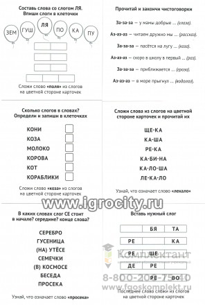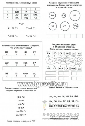 Комплект карточек познакомит ребенка с мягкими и твердыми согласными, научит различать слоги в словах, составлять из них слова, классифицировать всегда мягкие и всегда твердые звуки, разовьет навыки чтения и письма. На цветной стороне карточек изображены слоги, из которых можно составить около 45 слов. На обороте карточек даются игры, задания и упражнения, которые не только сформируют представления о слоговой структуре слова, но и разовьют логическое мышление, память, мелкую моторику. Ребенок научится правильно произносить сонорные, свистящие и шипящие звуки, находить новые слова с этими звуками и даже сочинять с ними чистоговорки. Размер карточки 10 x 10 см.