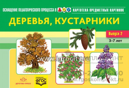 Пособие включает в себя наглядный дидактический материал, необходимый практически всем специалистам ДОО. Это комплект предметных картинок по лексическим темам «Деревья», «Кустарники», а также авторскиезагадки и дидактические игры с использованием материалов пособия.Пособие предназначено как для домашних занятий с ребенком, так и для создания картотек предметныхкартинок в детском саду. Можно извлечь предметные картинки из книжки, по необходимости заламинироватьих и, собрав все выпуски серии, создать новую картотеку предметных картинок по всем изучаемым в детскомсаду лексическим темам. Такая картотека является необходимой составляющей развивающей предметно-пространственной среды в каждой группе детского сада и позволяет проводить развивающие занятия и увле-кательные игры с детьми.