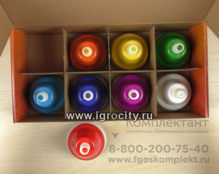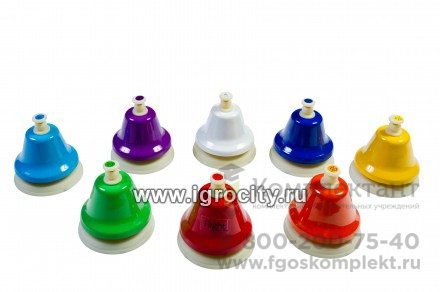 В наборе 8 цветных диатонических колокольчиков, каждый из которых настроен на определенную ноту. "до"(С) "ре"(D) "ми"(E) "фа"(F) "соль"(G) "ля"(A) "си"(B) "до"(C`) Каждый колокольчик имеет свой цвет, благодаря чему ребенку будет легче научиться различать ноты.