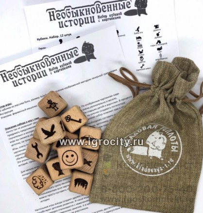 Набор кубиков "Необыкновенные истории" - это 12 кубиков и 72 изображения. С ними можно: погрузиться в мир фантазий, расширить словарный запас, умение красиво и понятно рассказывать истории. Навывки - так необходимые в школе и в жизни. Каждому кубику соответствует определенное понятие: герой, действие, предмет, эмоция, погода, транспорт, аксессуар, животное и т.д. Можно играть как одному, так и всей семьей - такие игры очень сближают! Вариантов игр с кубиками множество - несколько из них описаны в инструкции, которая идет в комплекте с набором. Необыкновенные истории - уникальная настольная игра, развивающая фантазию и речь. Это бесконечное количество волшебных историй, придуманных Вашим ребенком. Кубики можно использовать и для изучения иностранных языков. Размер: кубик 3х3 см. Материал: массив бука, все грани и углы скруглены, рисунки нанесены методом лазерной гравировки. Сохранены все тактильные ощущения дерева и его рисунок.