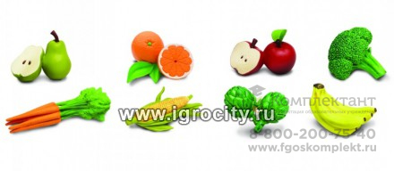 Набор из 8 фигурок овощей и фруктов, которые без труда можно найти на прилавках магазинов. Груши, апельсины, яблоки, артишоки, морковь и бананы, а также брокколи и кукуруза станут отличным дополнением для сюжетных игр. Будьте осторожны! Не смотря на свой аппетитный вид, эти фрукты и овощи совсем несъедобны. Зато таят в себе неисчерпаемый источник для игр и развития. Фигурки выполнены с непревзойденной точностью и раскрашены вручную. Размер: варьируется от 2,5 до 7,5 см.