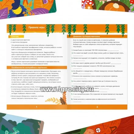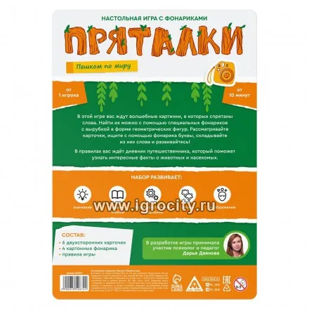 Настольная игра на поиск В этой игре малыша ждут волшебные картинки, на которых спрятаны слова. Ребёнок будет рассматривать карточки, искать буквы, складывать из них слова и развиваться! В правилах также есть дневник путешественника, который поможет узнать интересные факты о животных и насекомых. Как играть Задача ребёнка — найти в очертаниях предметов образы букв, которые соединяются в слова. Сделать это можно с помощью специальных карточек-фонариков с вырубкой в форме геометрических фигур. Когда ребёнок соберёт все слова, он заполнит дневник путешественника с интересными фактами о животных. Эта викторина поможет ребёнку узнать новое о тех животных, которых он нашёл на карточках. Игра развивает: логику, навык чтения, внимание, пространственное мышление, воображение. В комплекте: 6 двухсторонних карточек, 4 картонных фонарика, правила игры. Играйте и развивайте внимание вместе с ЛАС ИГРАС!